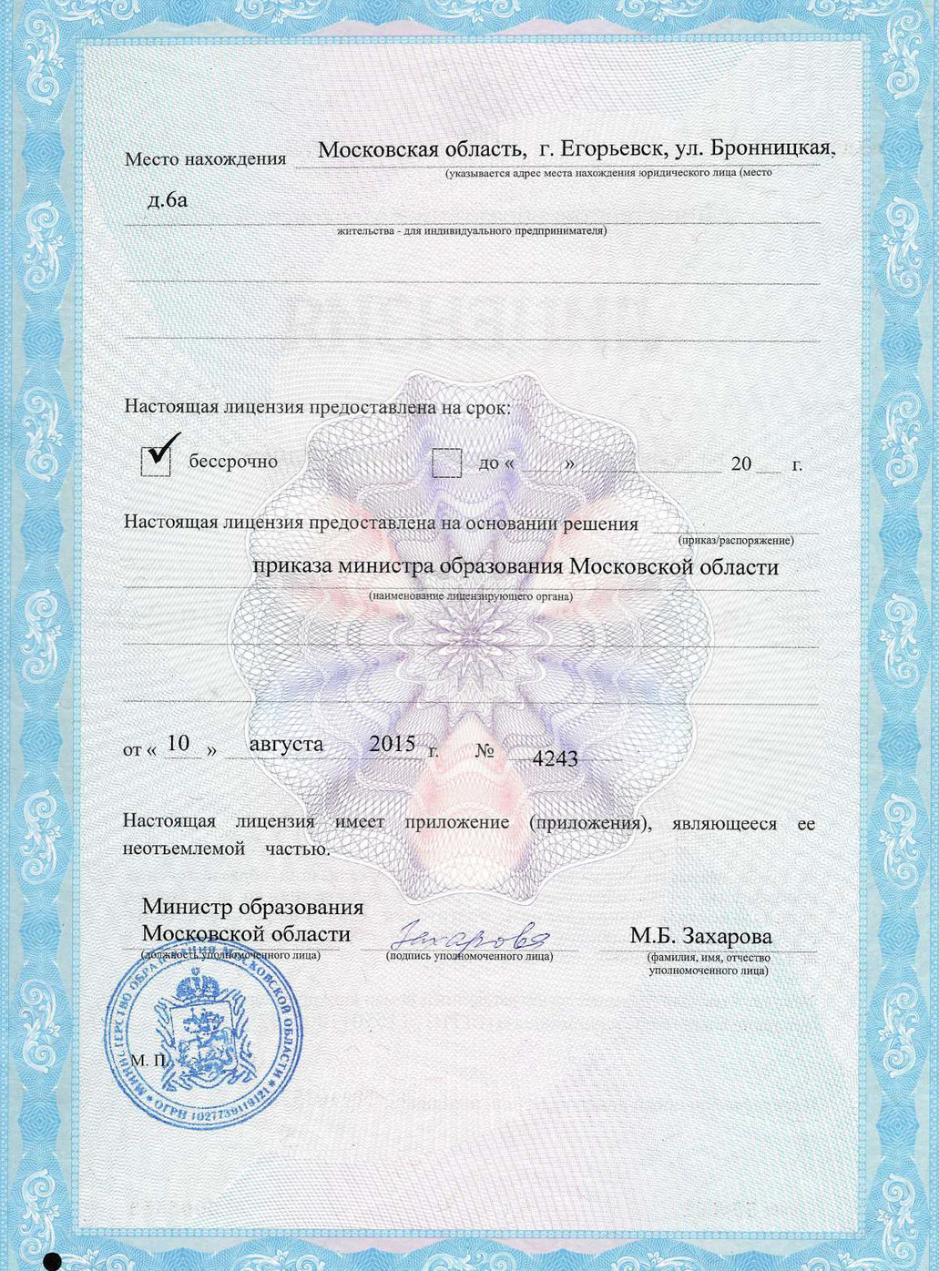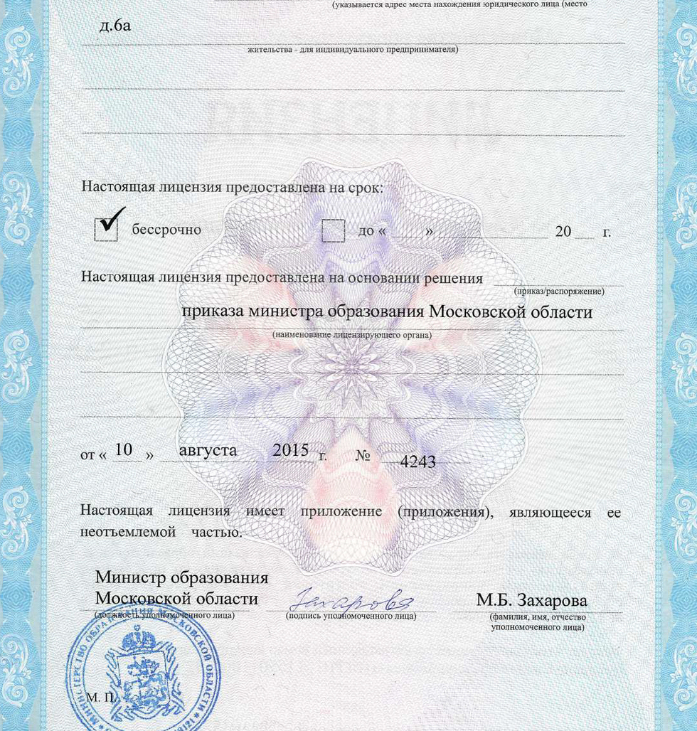 (Лицензия Серия 50Л01 № 0005555, выданная Министерством образования Московской области).