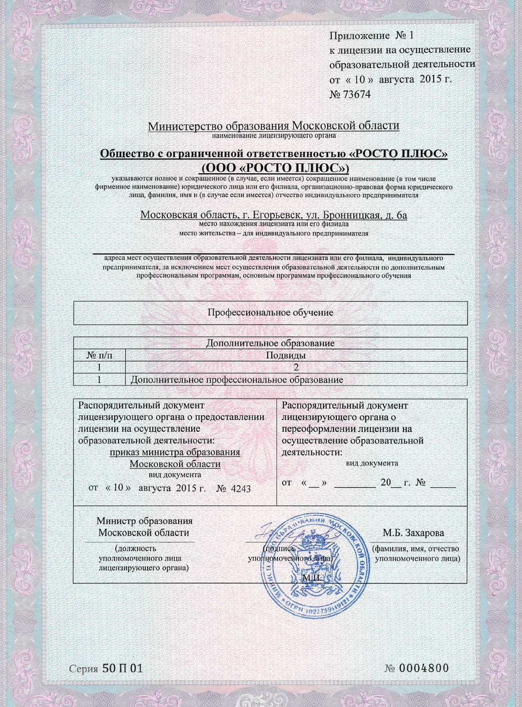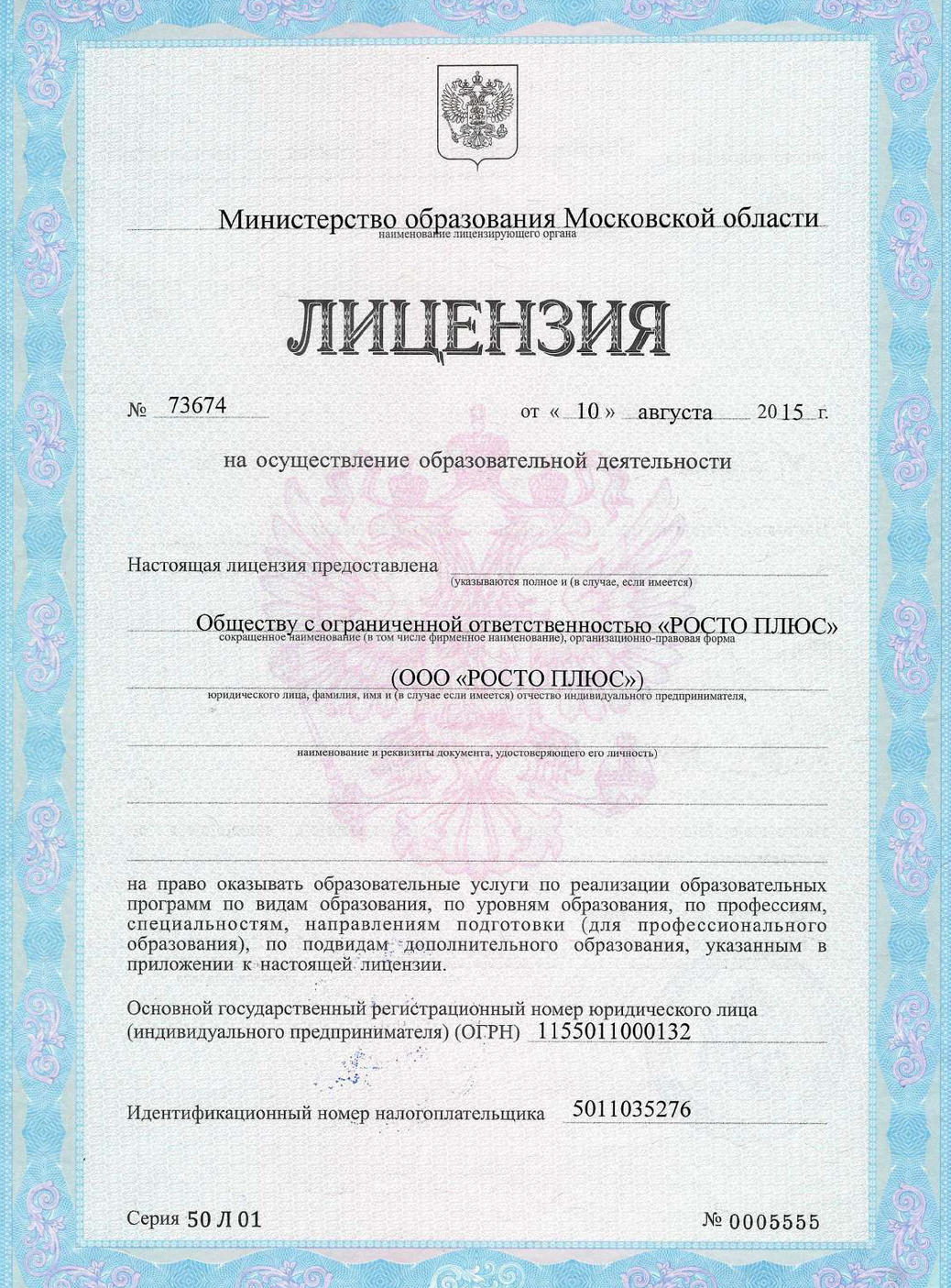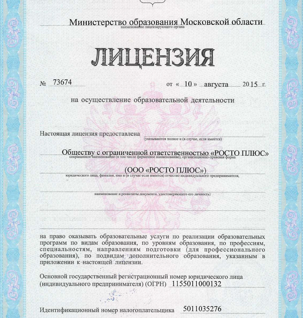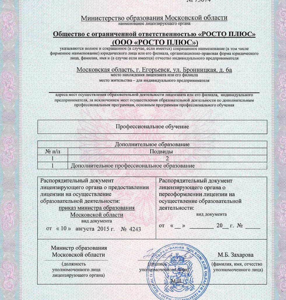 ООО "РОСТО ПЛЮС" осуществляет подготовку по программам профессионального и дополнительного профессионального образования в соответствии с действующей лицензией от 10.08.2015 №50Л01 0005555
